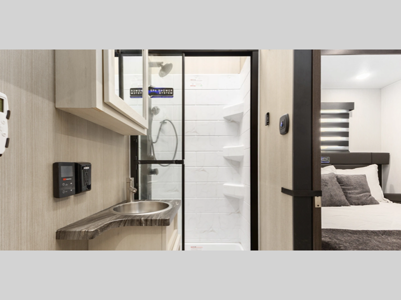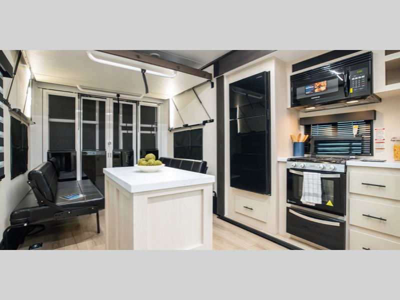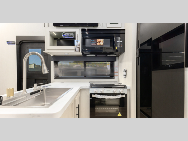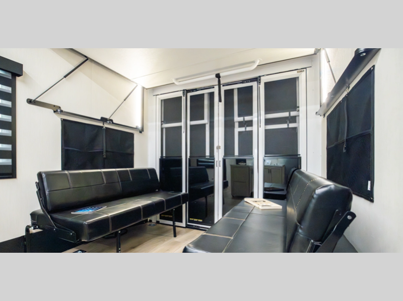 There is a 3,000 lb. rated ramp door on each model, along with DuraPoxy gas/oil resistant flooring, and 5,000 lbs. tie-downs to keep your toys secure on the way to the campground. You can enjoy your toy hauler for years to come thanks to the aluminum frame sidewalls and radius PVC walk-on roof, and the 102" wide body construction will make it easier than ever to load up dirt bikes, four-wheelers, or kayaks! Inside, you'll love the zebra shades in the living areas, the glass shower doors, the quick set garage bed system, and many more comforts!
