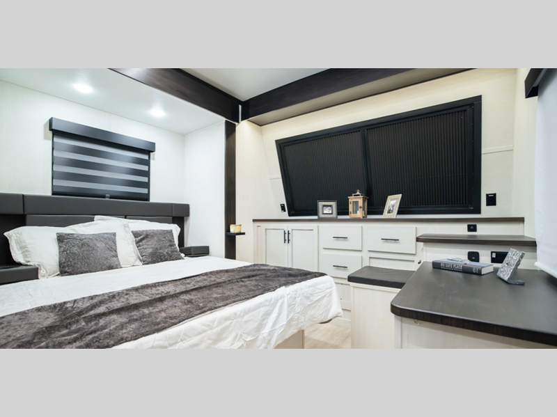 Sleeps 7 Slides 2 Length 39 ft 11 in Ext Width 8 ft 6 in Ext Height 12 ft 10 in Hitch Weight 1620 lbs GVWR 13620 lbs Dry Weight 10219 lbs Cargo Capacity 3401 lbs Fresh Water Capacity 102 gals Grey Water Capacity 100 gals Black Water Capacity 100 gals Tire Size 16" Furnace BTU 35000 btu Fuel Capacity 30 gals Number Of Bunks 1 Available Beds King Refrigerator Type 12V Black Glass Residential Style Refrigerator Size 10.7 cu ft Cooktop Burners 3 Number of Awnings 1 Axle Weight 6000 lbs Water Heater Type On Demand Tankless AC BTU 15000 btu TV Info LR LED Flatscreen Awning Info 18' Power w/LED Lights Axle Count 2 Shower Type Standard Electrical Service 50 amp Solar Wattage 200 watts Similar Floorplans