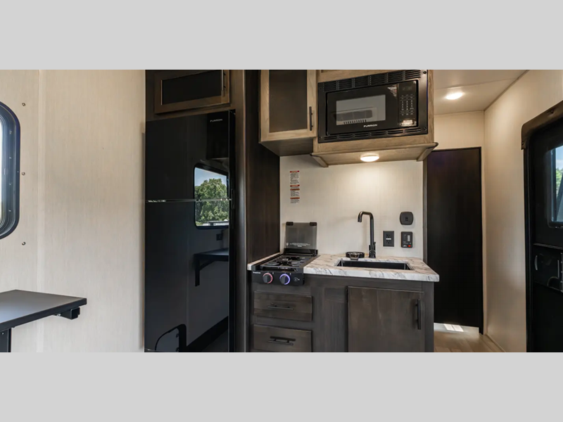 You will love the real wood cabinet doors and drawers inside, along with LED lights and a black stainless steel farm sink that will have you feeling more at home. There are power stabilizer jacks to make your RV more secure, and the power awning with LED accent lighting will create an outdoor space campground neighbors will want to check out.