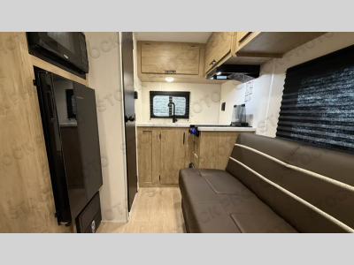 You will be enchanted by this travel trailer! The bathroom is equipped with everything you need for a comfortable stay. The kitchen is equipped with a refrigerator for keeping drinks and perishables fresh, a microwave for quick reheating, and a cooktop for preparing meals. The sofa provides a comfortable seating area for relaxation and an extra sleeping area. Overhead cabinets and a shelf provide additional storage for essentials, cookware, and dishes. The queen-sized bed allows a comfortable sleeping space, perfect for unwinding after a long day.